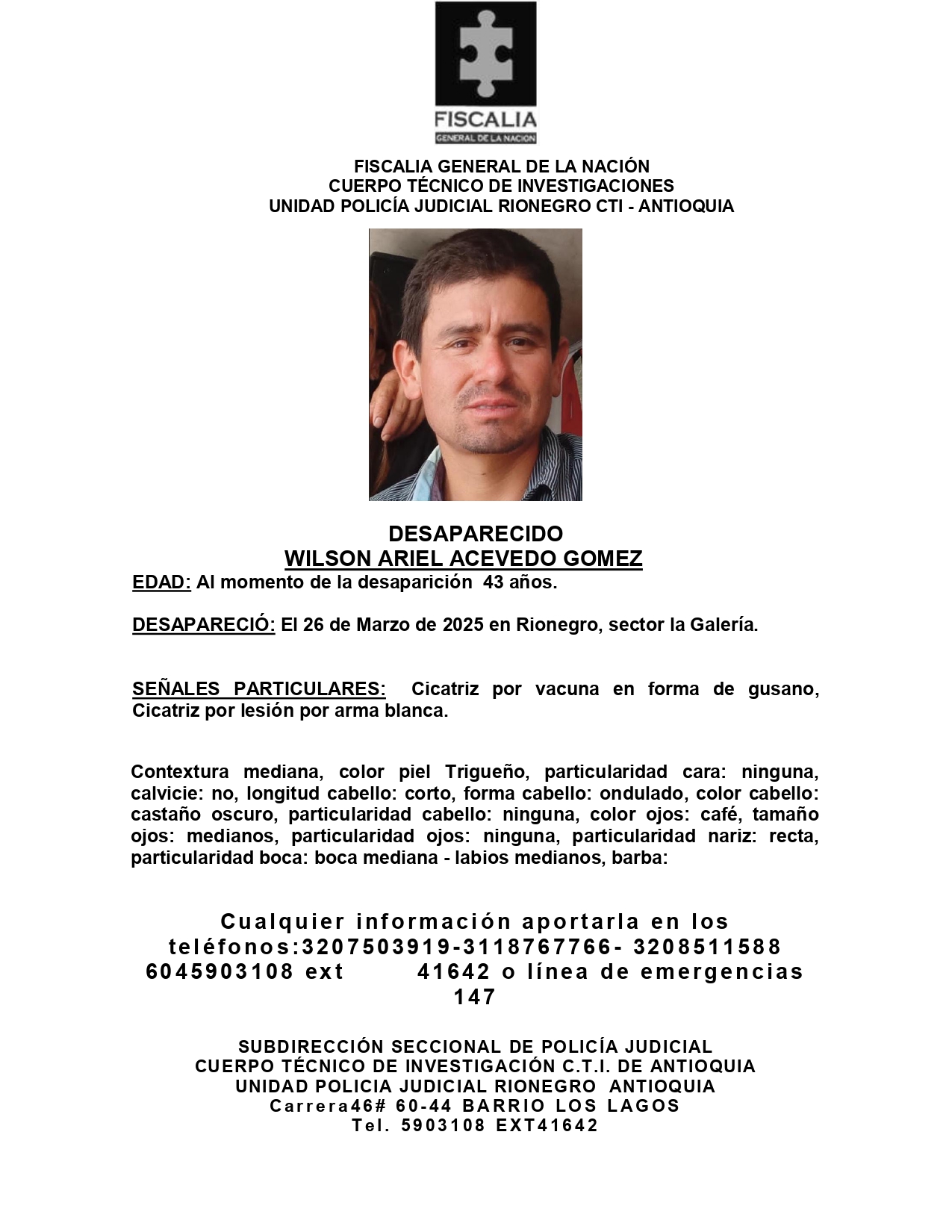 Cualquier persona que tenga información sobre la ubicación o que haya visto a Wilson Ariel Acevedo Gómez después del 26 de marzo, por favor, comuníquese de inmediato. La información debe ser aportada a los siguientes números telefónicos: