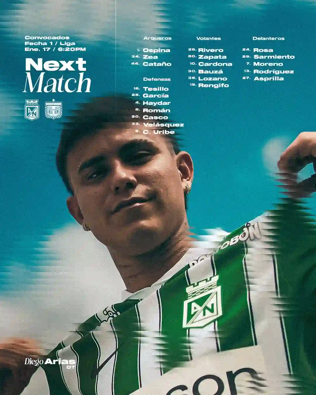 Resumen: El director técnico de Atlético Nacional, Diego Arias, definió la lista de convocados para el debut en la Liga BetPlay I-2026 frente a Boyacá Chicó, encuentro que se disputará este sábado en el Atanasio Girardot. El grupo destaca por la inclusión de los nuevos refuerzos Kevin Cataño, Milton Casco y Nicolás Rodríguez, además del llamado del prometedor juvenil de 18 años Matías Lozano. Con una nómina que equilibra la experiencia de figuras como David Ospina y Edwin Cardona con sangre nueva, el conjunto "verdolaga" inicia una nueva etapa oficial bajo la ratificación de Arias en el banquillo.