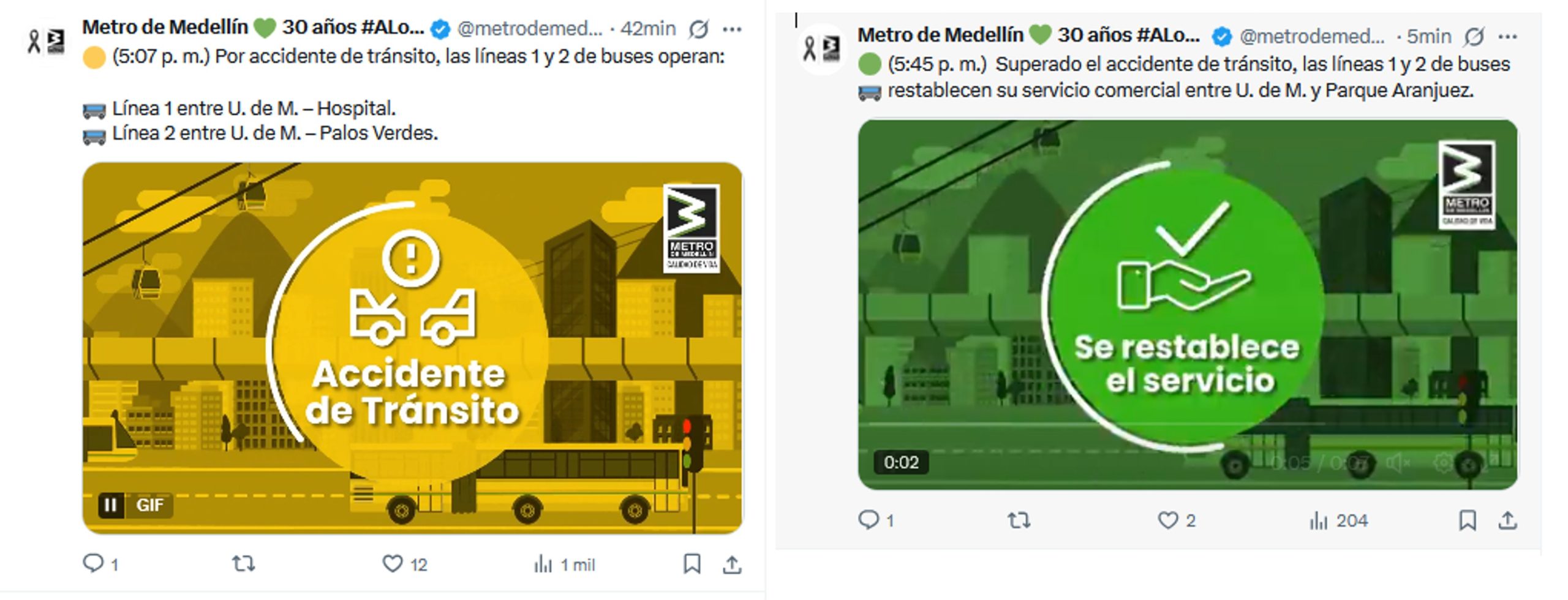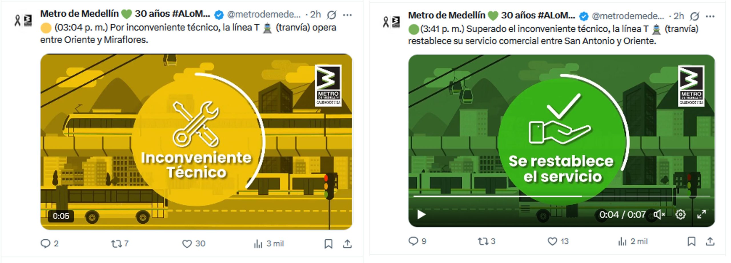 El primer incidente se reportó a las 3:04 p.m. debido a un inconveniente técnico, obligando al tranvía a operar solo en el tramo entre Oriente y Miraflores. Afortunadamente, esta afectación fue superada a las 3:41 p.m. cuando se restableció el servicio comercial completo entre San Antonio y Oriente.