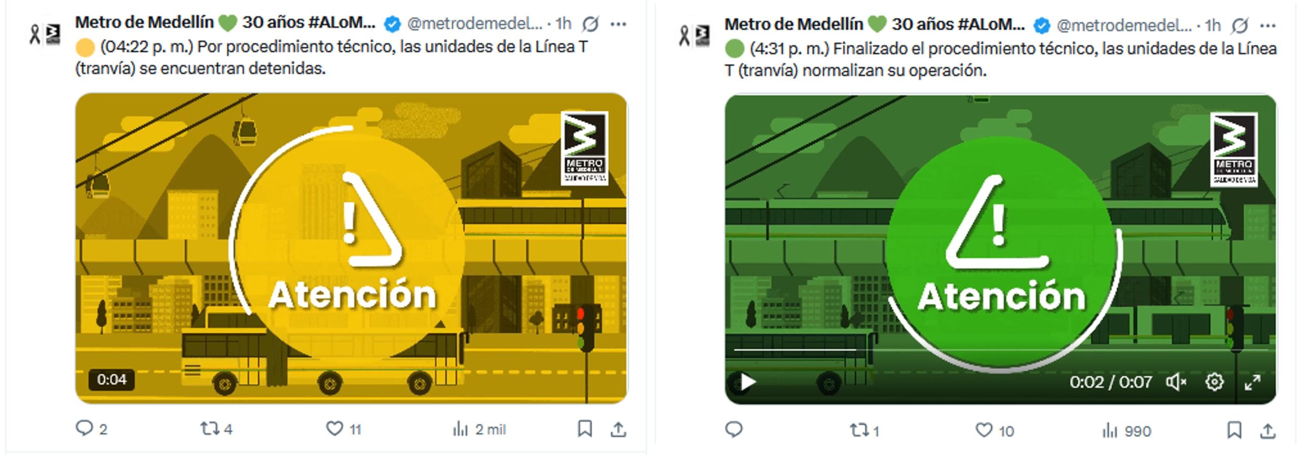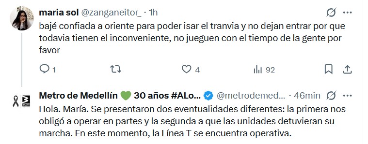 Sin embargo, la normalidad duró poco. A las 4:22 p.m. se reportó una segunda interrupción: «Por procedimiento técnico, las unidades de la Línea T (tranvía) se encuentran detenidas». Aunque el Metro informó a las 4:31 p.m. que la operación se normalizaba, el daño ya estaba hecho.