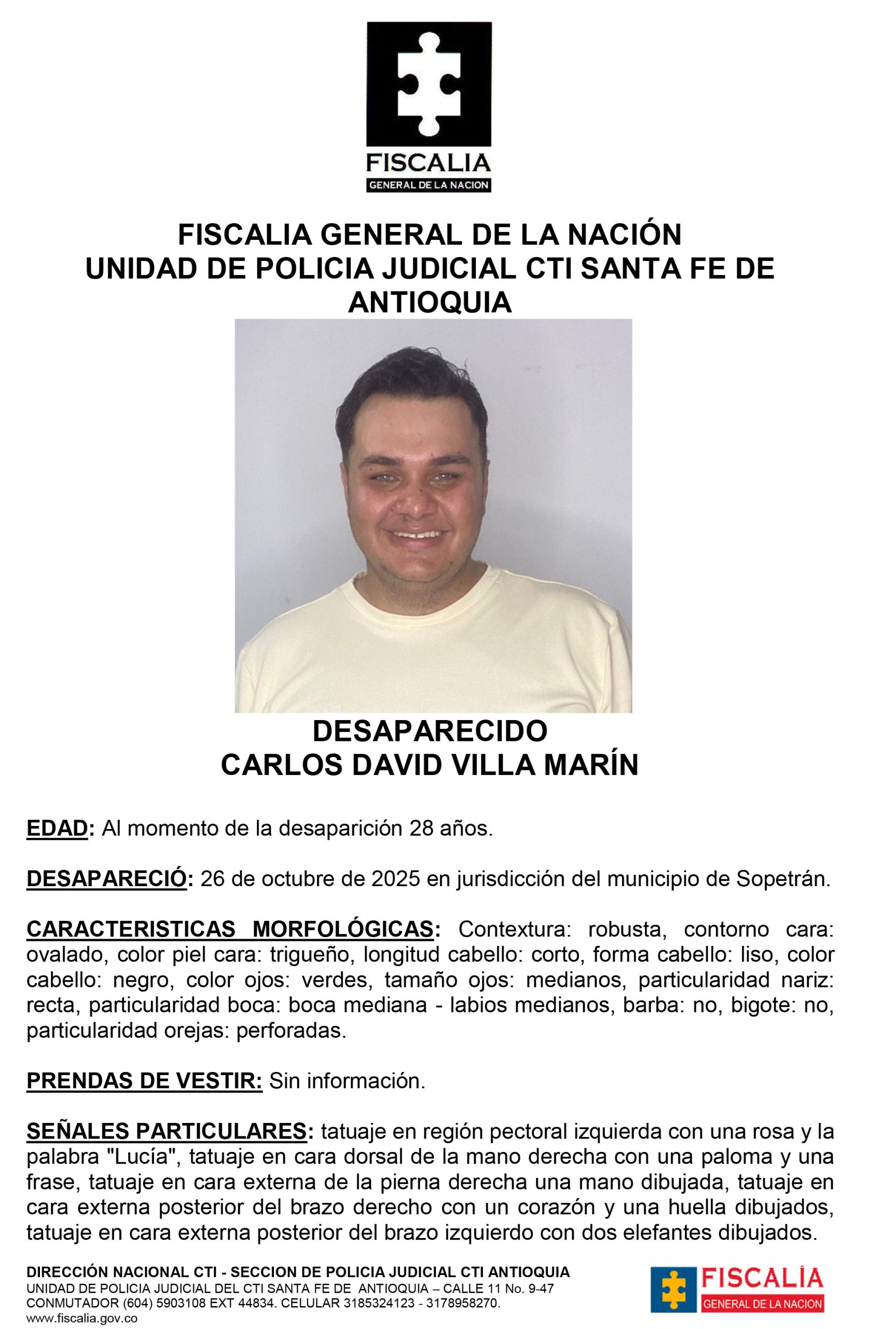 Resumen: Carlos David Villa Marín, de 28 años, desapareció el 26 de octubre de 2025 en la jurisdicción del municipio de Sopetrán.