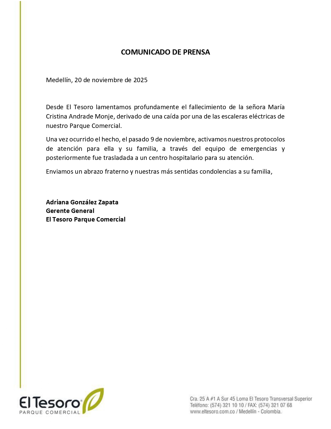Resumen: El Centro Comercial El Tesoro Parque Comercial emitió un comunicado oficial este 20 de noviembre, un día después del deceso reportado, lamentando el fallecimiento de la señora María Cristina Andrade Monje, de 76 años. La muerte fue un desenlace fatal derivado de una caída sufrida en una de las escaleras eléctricas del parque comercial.