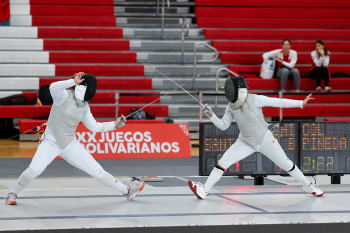 Rafaela Augusta Santibáñez, de Chile (i), compite contra Juliana Pineda Valencia, de Colombia, en las semifinales de esgrima de los vigésimos Juegos Bolivarianos este jueves, en Lima (Perú). EFE/ José Jácome.(EFE). Colombia llegó este jueves a 143 medallas, 61 de ellas de oro, con lo que amplió su ventaja en el liderato de los XX Juegos Bolivarianos, en una quinta jornada de competencia que también permitió a Perú avanzar hasta la tercera posición.