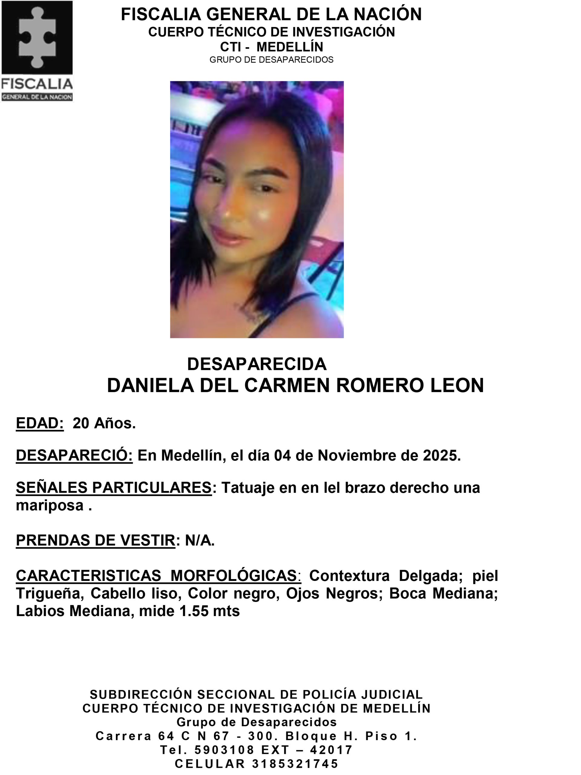 Daniela del Carmen Romero León, de 20 años de edad, fue reportada como desaparecida en la ciudad de Medellín el 4 de noviembre de 2025.