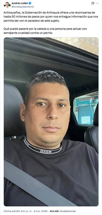 Minuto30.com .- El gobernador de Antioquia, Andrés Julián Rendón, ha emitido un contundente llamado a la ciudadanía, ofreciendo una alta recompensa por información que conduzca a la captura de un sujeto que cometió un acto de extrema crueldad contra un perro.