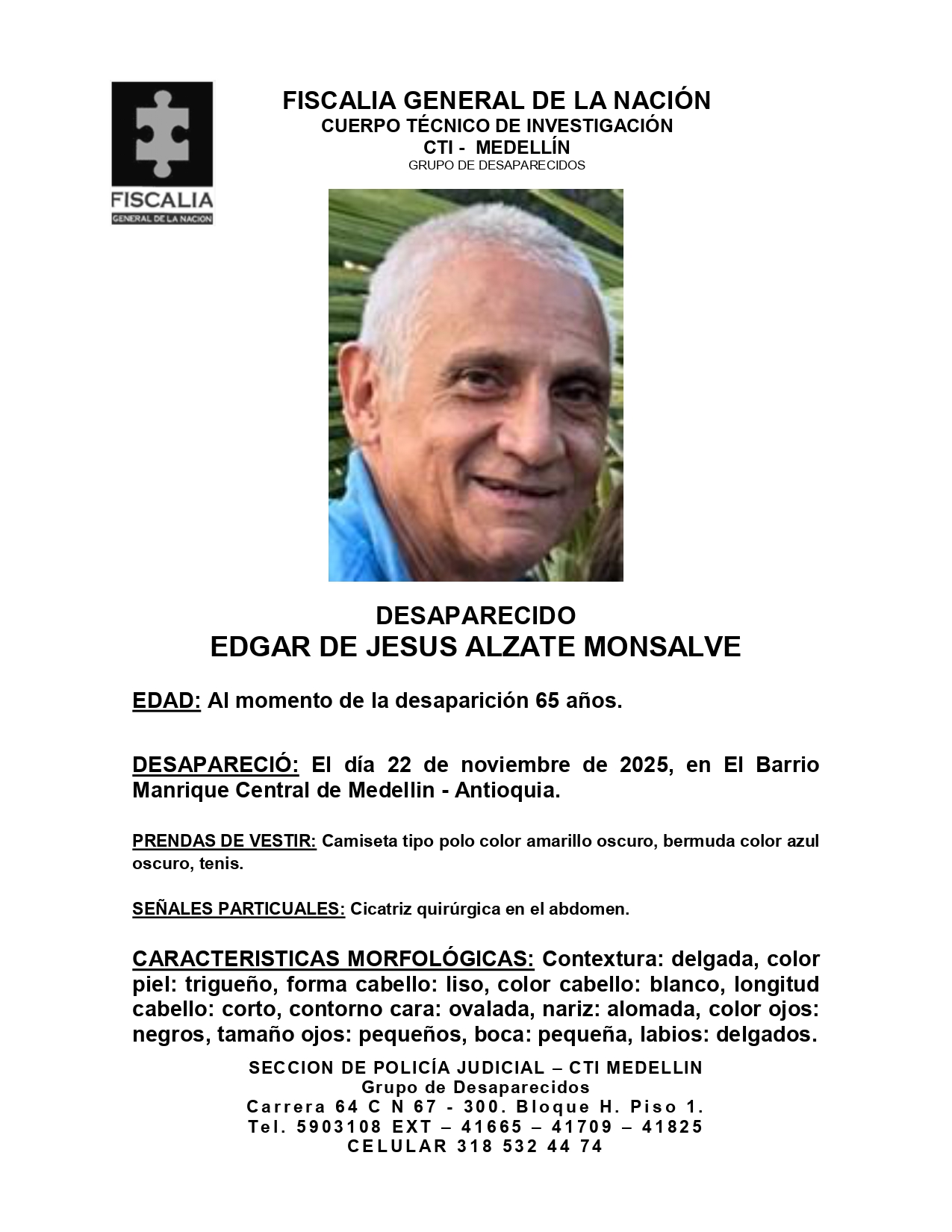 Minuto30.com .- Se solicita la colaboración de la ciudadanía para localizar a Edgar de Jesús Alzate Monsalve, un adulto mayor de 65 años de edad, quien se encuentra desaparecido desde el pasado 22 de noviembre de 2025. Su última ubicación conocida fue en el barrio Manrique Central de Medellín, Antioquia.