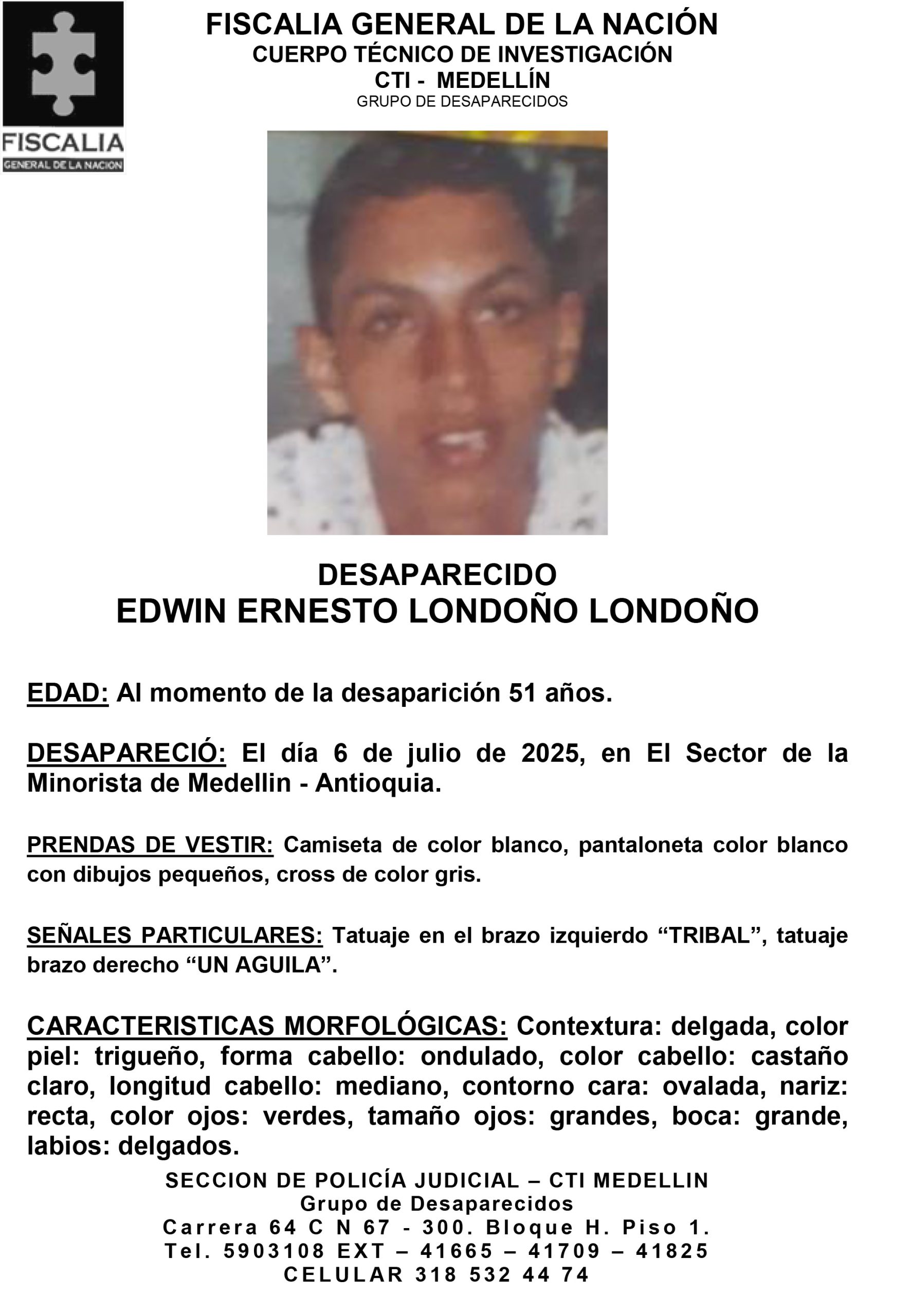 Edwin Ernesto Londoño Londoño, de 51 años, desapareció el 6 de julio de 2025 en el sector de la Minorista en Medellín, Antioquia. Al momento de su desaparición vestía una camiseta blanca, pantaloneta blanca con dibujos pequeños y zapatos tipo cross grises.