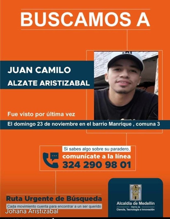 Se solicita la colaboración ciudadana para encontrar a Juan Camilo Alzate Aristizábal, cuyo rastro se perdió el pasado 23 de noviembre de 2025 en el barrio Manrique, perteneciente a la Comuna 3 de Medellín.