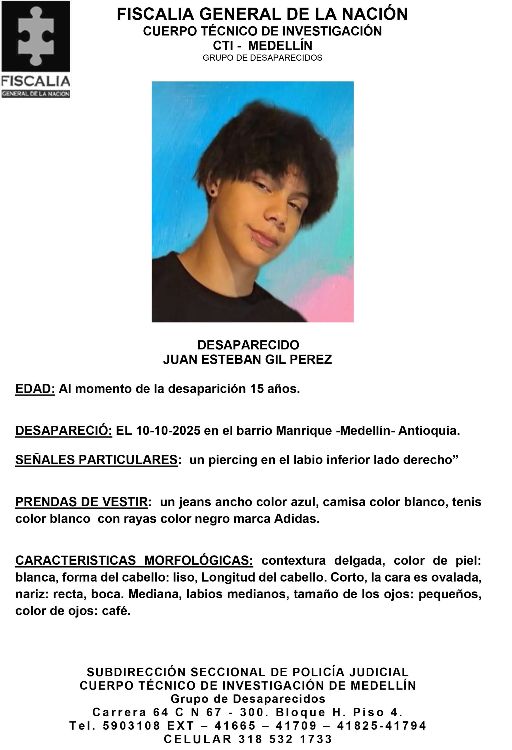 Juan Esteban Gil Pérez es un menor de 15 años que fue reportado como desaparecido el pasado 10 de octubre de 2025, en el barrio Manrique de la ciudad de Medellín, Antioquia.
