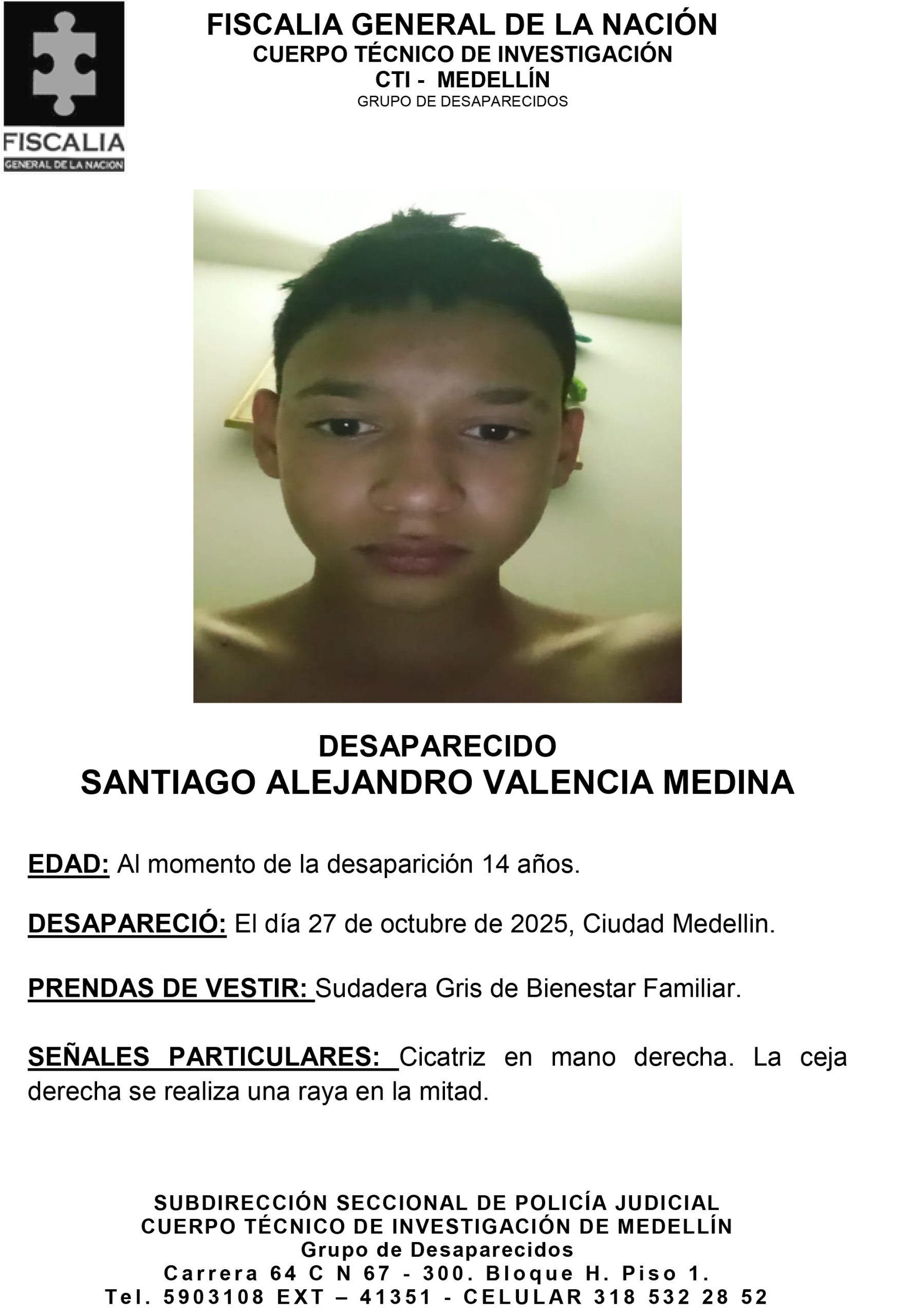 Santiago Alejandro Valencia Medina es un adolescente de 14 años que se encontraba bajo la protección del Bienestar Familiar. Su desaparición ocurrió el 27 de octubre de 2025 en la ciudad de Medellín.
