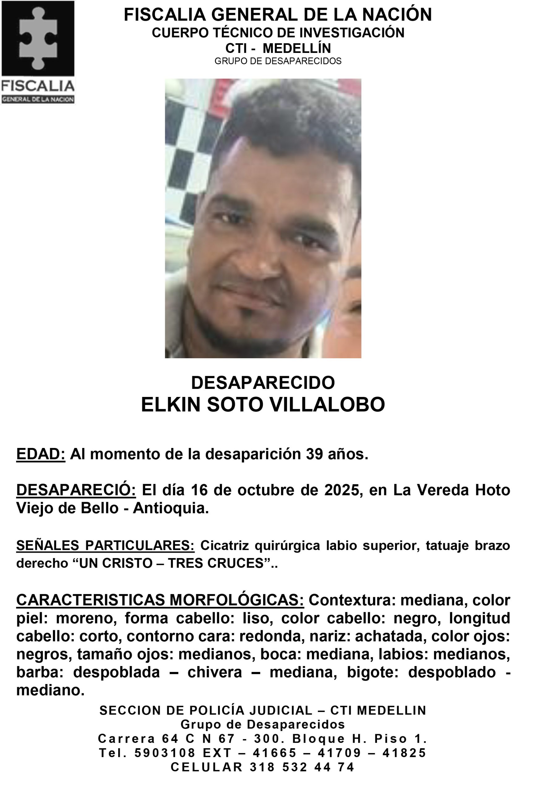Resumen: Elkin Soto Villalobo, de 39 años, fue reportado como desaparecido el 16 de octubre de 2025 en la vereda Hoto Viejo, municipio de Bello, Antioquia.