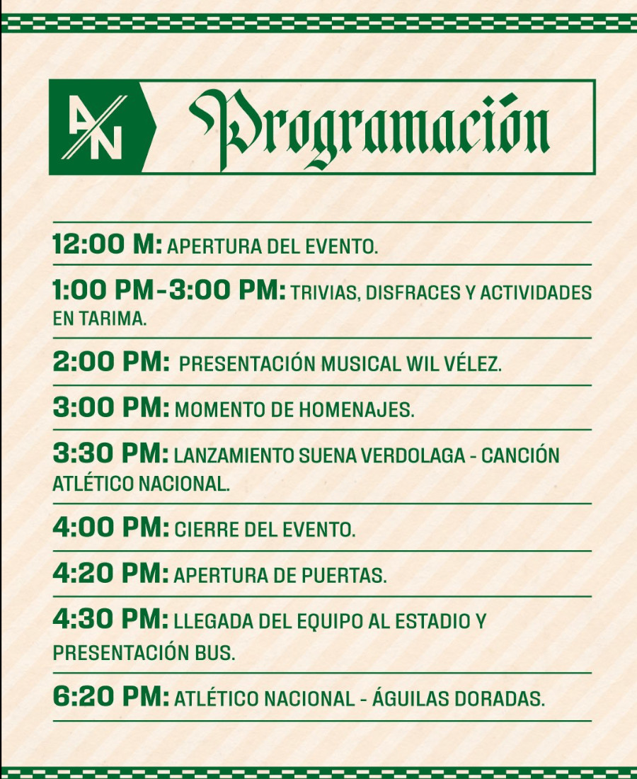 A las 4:20 PM se dará la apertura de puertas del Atanasio Girardot, y a las 4:30 PM se espera uno de los momentos más emotivos: la Llegada del Equipo al Estadio y Presentación del nuevo Bus, un ritual que une a jugadores e hinchas en un solo rugido.