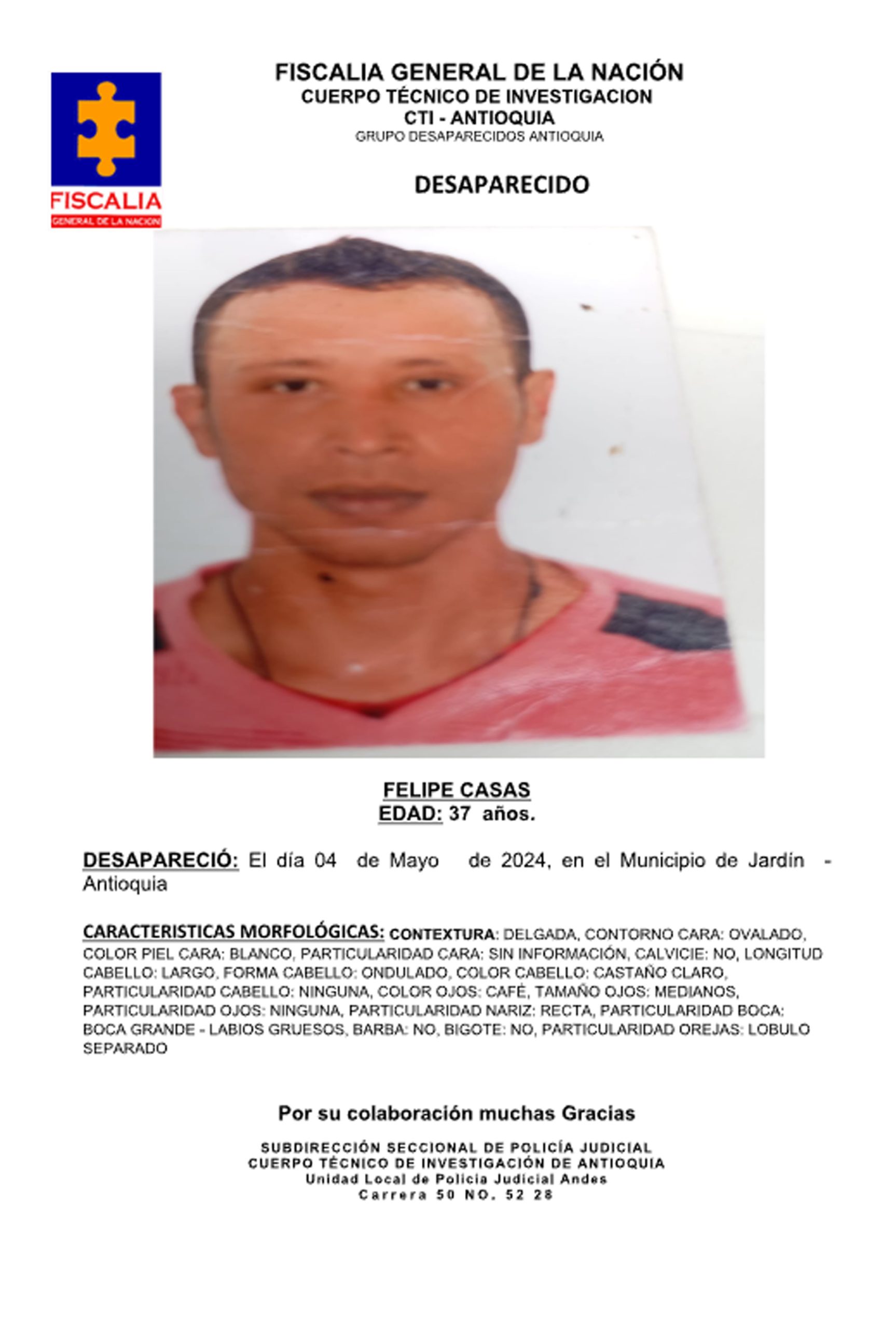 Resumen: Felipe Casas es un hombre de 37 años que desapareció el 4 de mayo de 2024 en el municipio de Jardín, Antioquia.