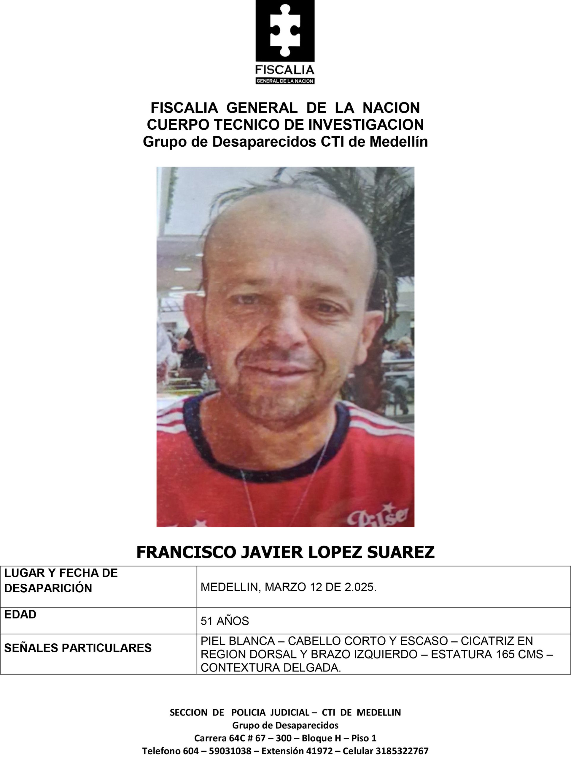 Resumen: Francisco Javier López Suárez, de 51 años, desapareció en Medellín el 12 de marzo de 2025.