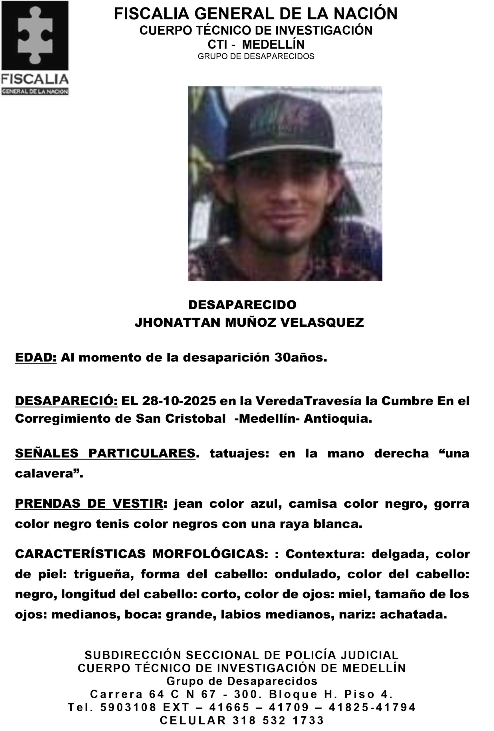 Resumen: Jhonattan Muñoz Velásquez, de 30 años, fue reportado como desaparecido el 28 de octubre de 2025 en la vereda Travesía La Cumbre, ubicada en el corregimiento de San Cristóbal, Medellín, Antioquia.