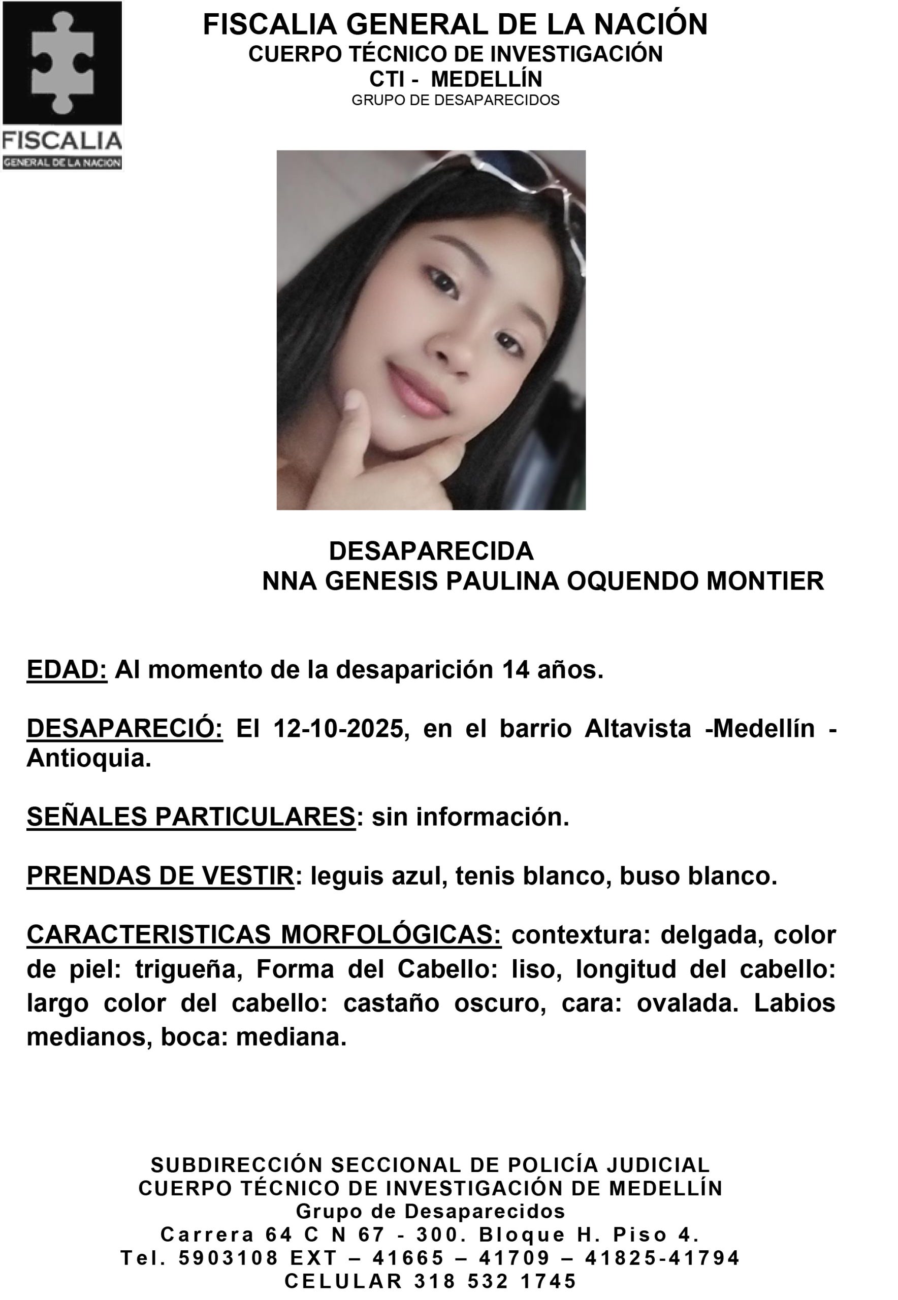 Génesis Paulina Oquendo Montier, una adolescente de 14 años, fue reportada como desaparecida el 12 de octubre de 2025 en el barrio Altavista, ubicado en Medellín, Antioquia.