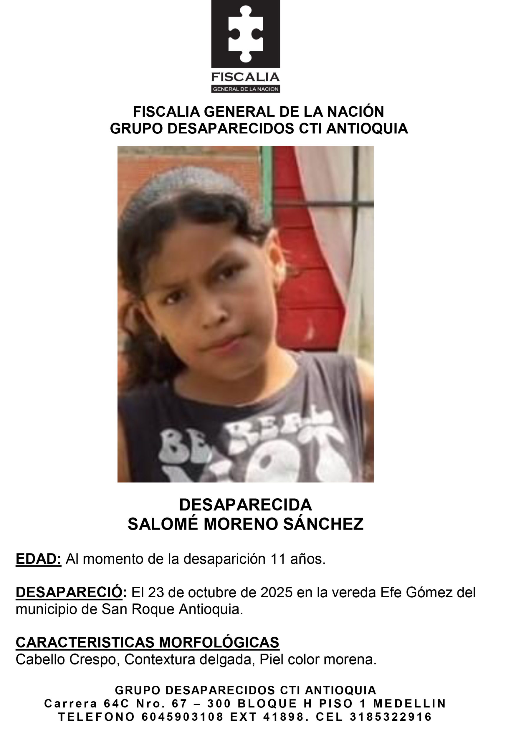 Salomé Moreno Sánchez tenía 11 años al momento de su desaparición. La menor desapareció el 23 de octubre de 2025 en la vereda Efe Gómez, ubicada en el municipio de San Roque, Antioquia.