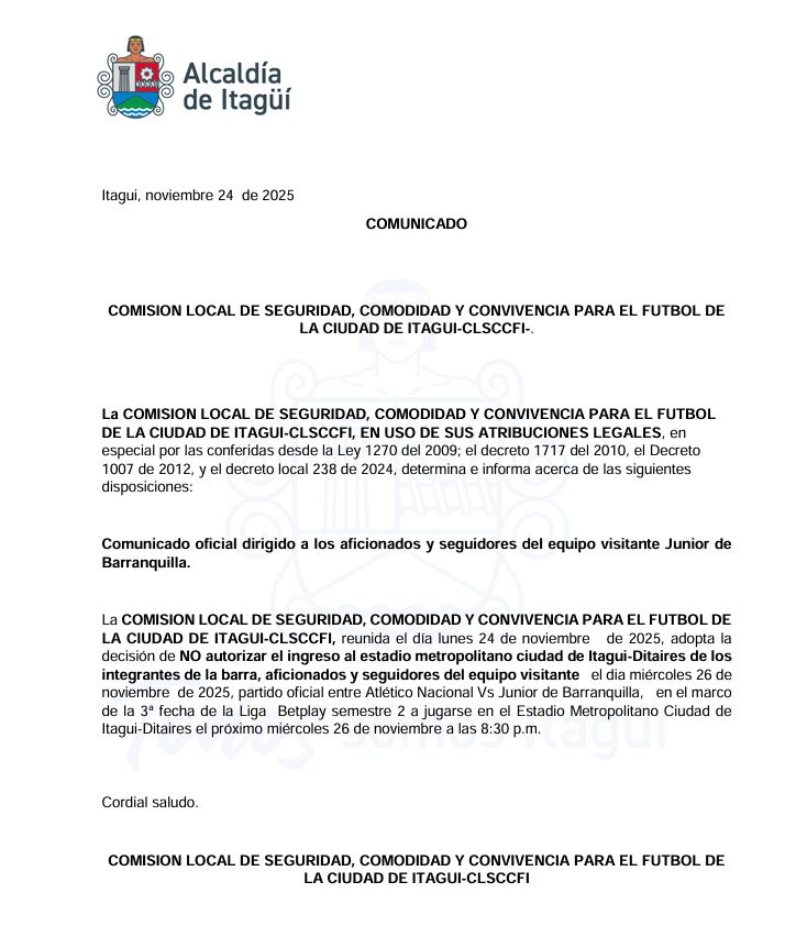 “La CLSCCFI, reunida el día lunes 24 de noviembre de 2025, adopta la decisión de NO autorizar el ingreso al estadio metropolitano ciudad de Itagui-Ditaires de los integrantes de la barra, aficionados y seguidores del equipo visitante el día miércoles 26 de noviembre de 2025…”, reza la parte central de la comunicación.