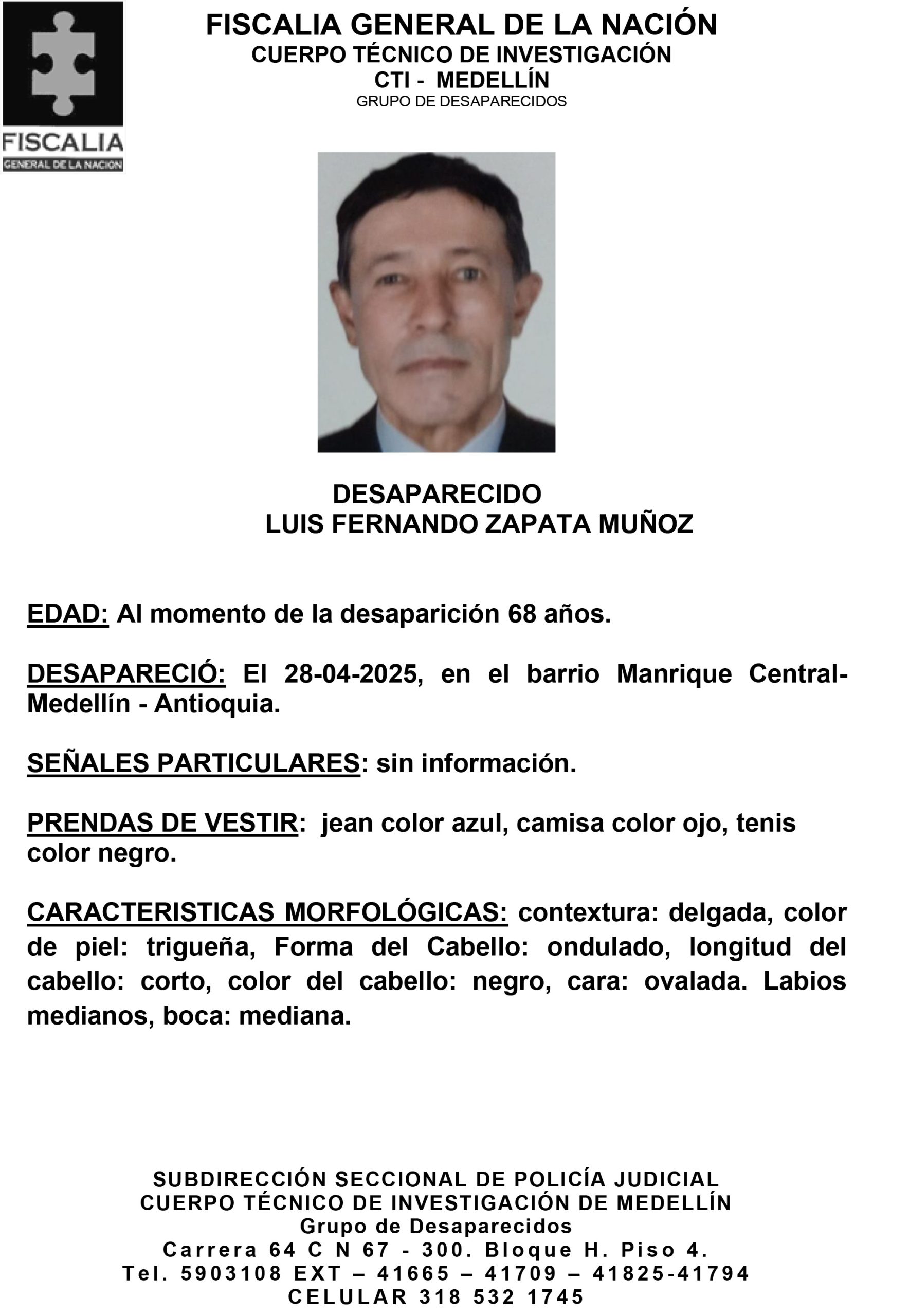 Luis Fernando Zapata Muñoz, de 68 años de edad al momento de su desaparición, fue visto por última vez el 28 de abril de 2025 en el barrio Manrique Central, en la ciudad de Medellín, Antioquia.