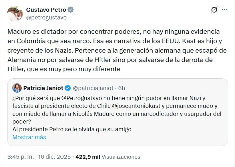 En el mismo pronunciamiento, Petro aprovechó para lanzar una dura crítica contra el recientemente electo José Antonio Kast en Chile, vinculando su linaje y creencias con el nazismo.