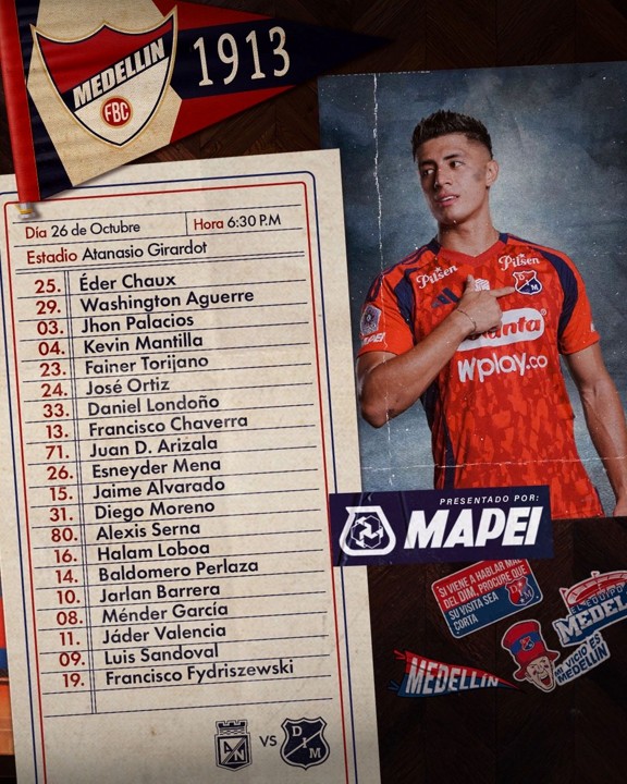 El director técnico del DIM, Alejandro Restrepo, escogió los 20 convocados con la que buscará la victoria en el Atanasio Girardot. Entre los convocados más destacados del ‘Poderoso de la Montaña’ se encuentran: Washington Aguerre; Francisco Chaverra, Jarlan Barrera, Baldomero Perlaza, Luis «Chino» Sandoval y el goleador Francisco Fidryszewski.