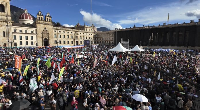 Miles de personas se concentraron este jueves en la Plaza de Bolívar de Bogotá para defender el «salario vital» que propone el Gobierno y rechazar la suspensión que hizo el máximo tribunal administrativo de Colombia al decreto que aumentó el salario mínimo en un 23,7 % para este año.
