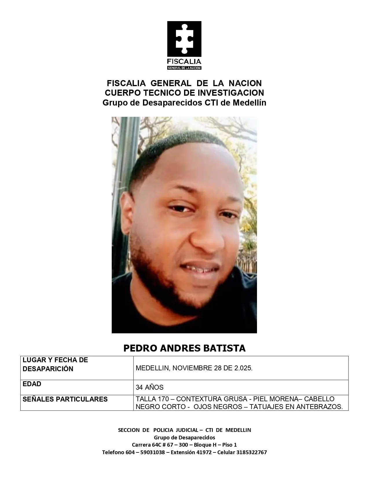 Minuto30.com .- Se solicita la colaboración de la comunidad para dar con el paradero de Pedro Andrés Batista, un hombre de 34 años de edad que se encuentra desaparecido desde el pasado 28 de noviembre de 2025 en la ciudad de Medellín.
