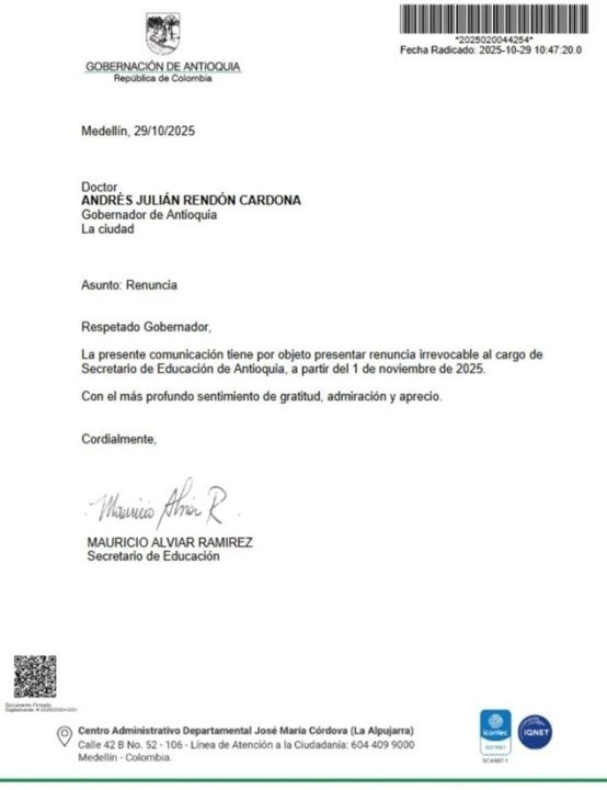 Minuto30.com .- El panorama político en Antioquia se mueve tras conocerse la renuncia irrevocable de Mauricio Alviar Ramírez al cargo de Secretario de Educación del departamento. La carta, dirigida al gobernador Andrés Julián Rendón, fue conocida este jueves 30 de octubre.
