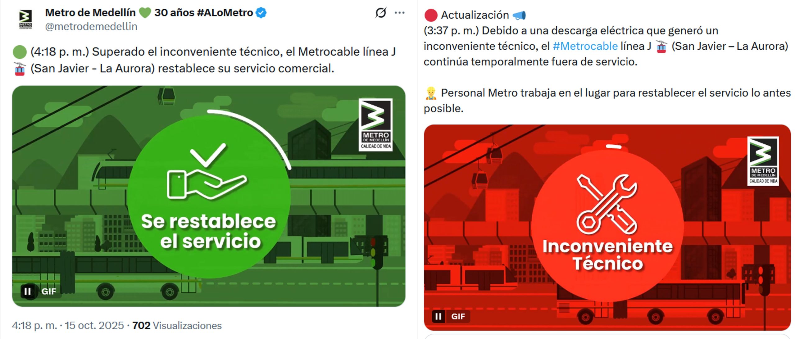 Minuto30.com .- El Metro de Medellín (@metrodemedellin) ha informado que el servicio del Metrocable Línea J (San Javier – La Aurora) ha sido completamente restablecido.