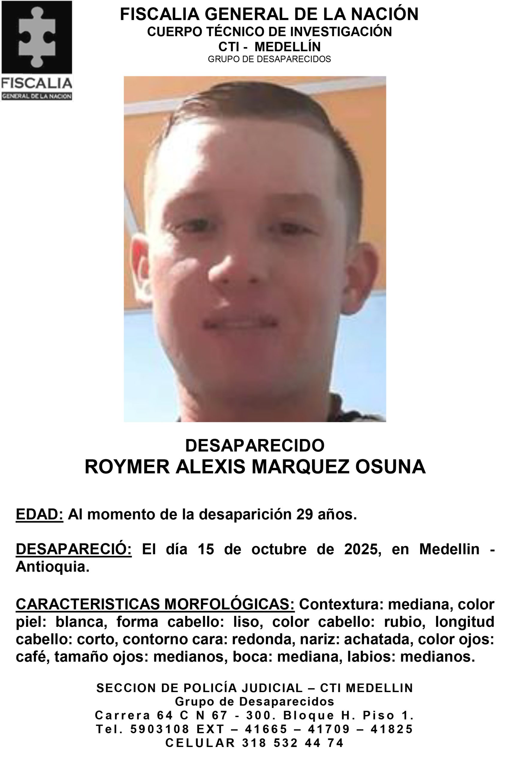 Resumen: Roymer Alexis Márquez Osuna, de 29 años, desapareció el 15 de octubre de 2025 en la ciudad de Medellín, Antioquia.