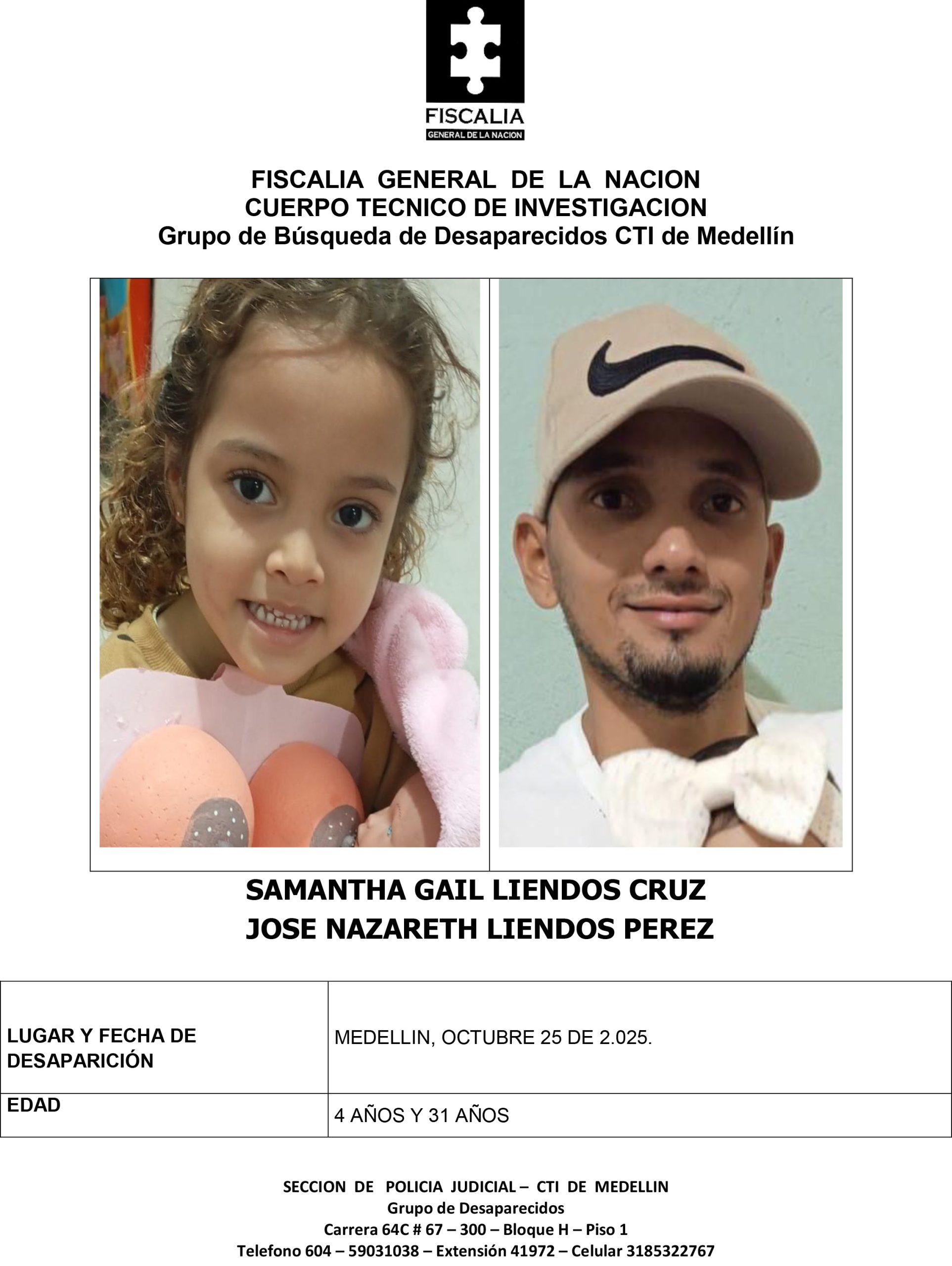 Resumen: Samantha Gail Liendos Cruz, de 4 años, y José Nazareth Liendos Pérez, de 31 años, desaparecieron en Medellín el 25 de octubre de 2025.