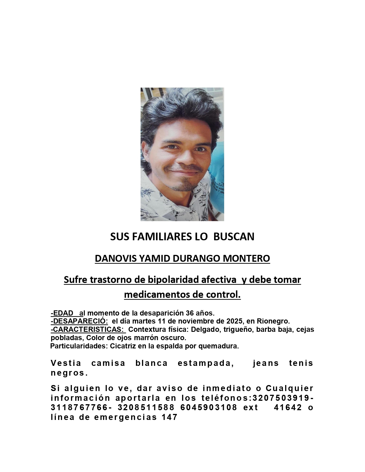 Minuto30.com .- Danovis Yamid Durango Montero, de 36 años, desapareció el pasado martes 11 de noviembre de 2025 en el municipio de Rionegro. Su búsqueda es de extrema prioridad, ya que el joven sufre de trastorno de bipolaridad afectiva y debe tomar medicamentos de control de manera regular.