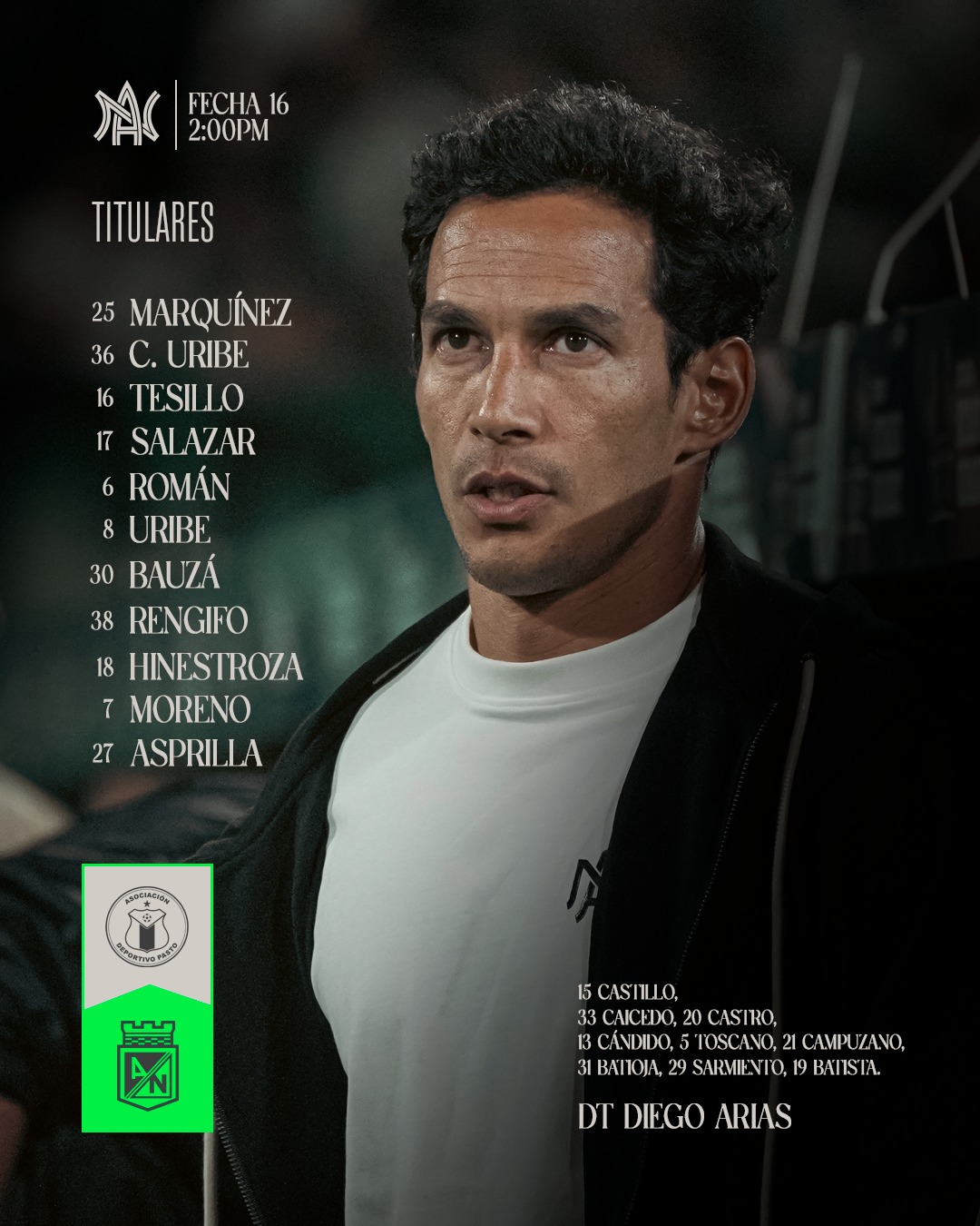 Diego Arias, técnico de Atlético Nacional, anunció los titulares con los que arrancará el juego frente al Deportivo Pasto.