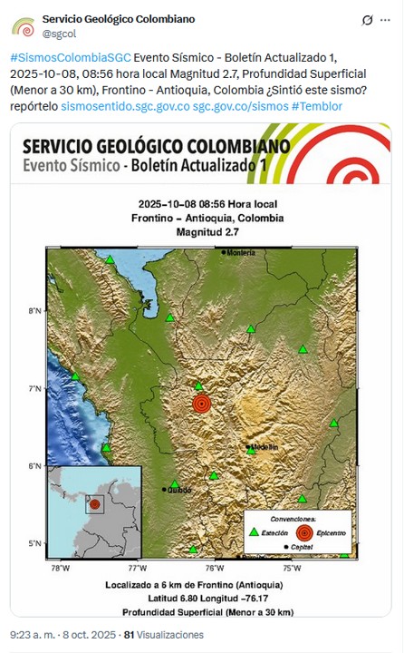 Minuto30.com .- Más de media hora se demoró el Servicio Geológico Colombiano para confirmar un evento sísmico en el departamento de Antioquia este 8 de octubre de 2025.