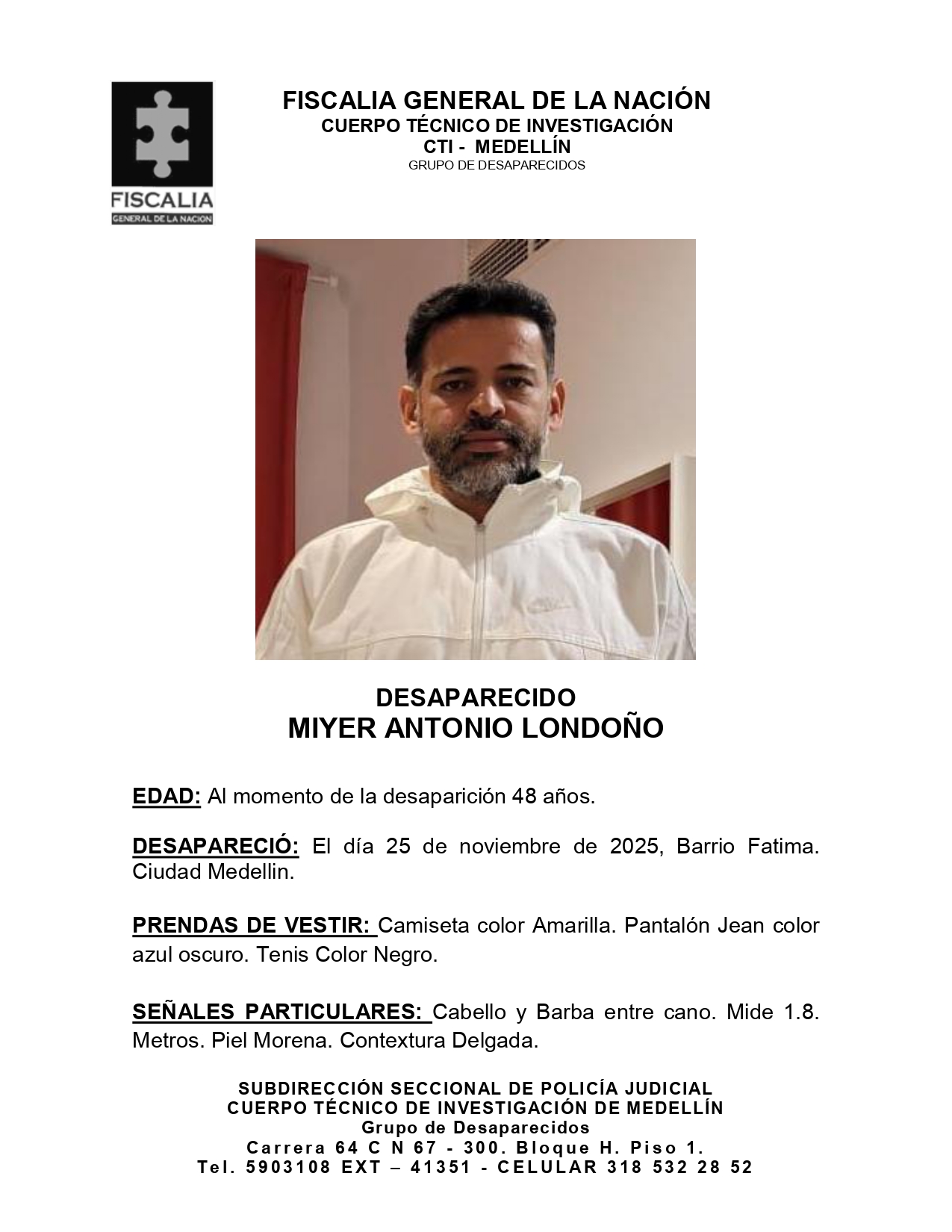 Cualquier persona que posea información sobre Miyer Antonio Londoño puede comunicarse de inmediato con la Unidad de Personas Desaparecidas de la Fiscalía. Los números de contacto son: teléfono fijo 5903108 (Ext. 41351) o el celular 3185322852.