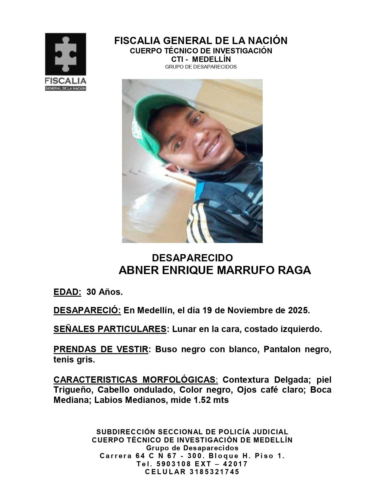 Minuto30.com .- Se solicita la colaboración ciudadana para localizar a Abner Enrique Marrufo Raga, un hombre de 30 años de edad que se encuentra desaparecido desde el pasado 19 de noviembre de 2025 en la ciudad de Medellín.