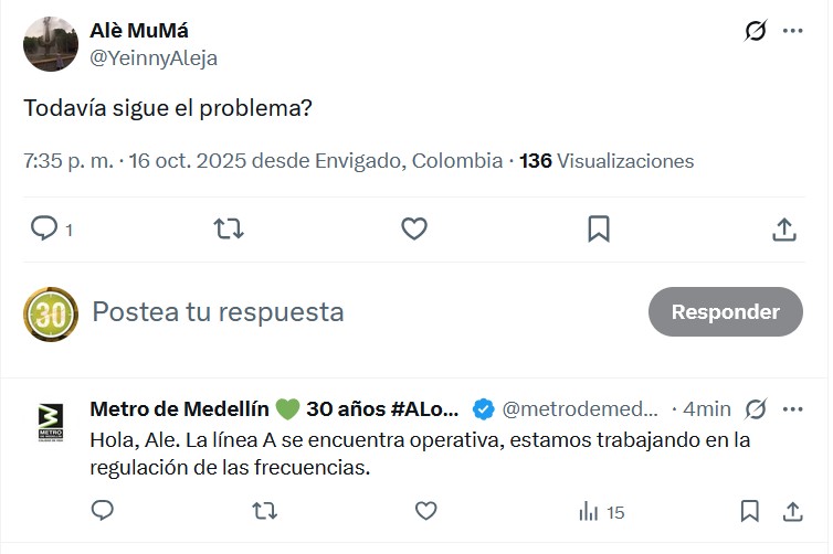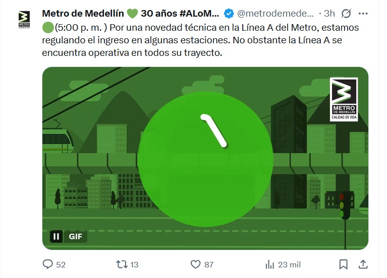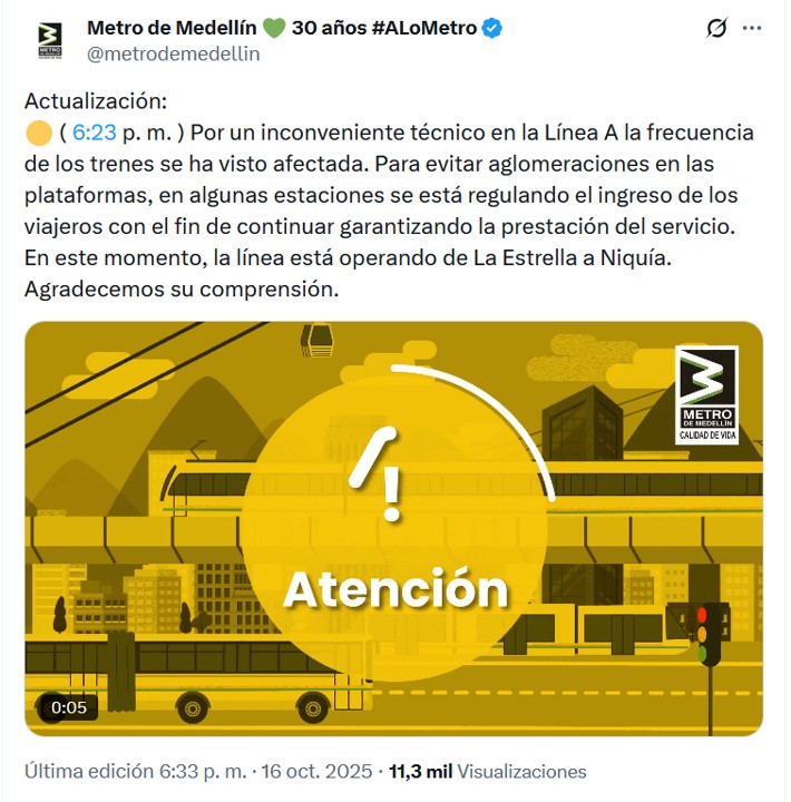 Minuto30.com .- Desde antes de las 5 de la tarde se reporta una afectación importante en el servicio de la Línea A del metro de Medellín. Solo hasta las 6:23 p.m., la empresa «actualizó la información» de un inconveniente técnico que ha impactado la frecuencia de los trenes.