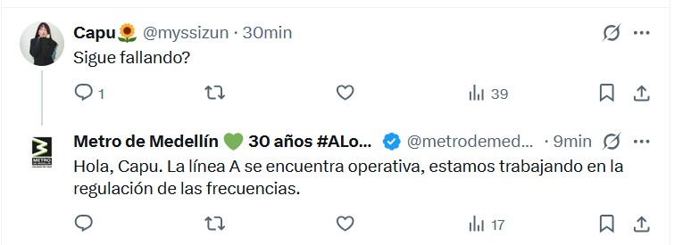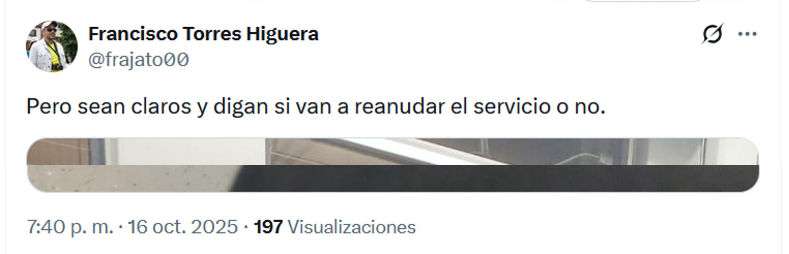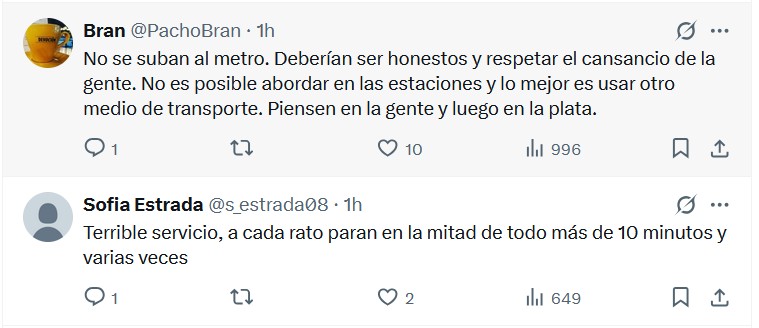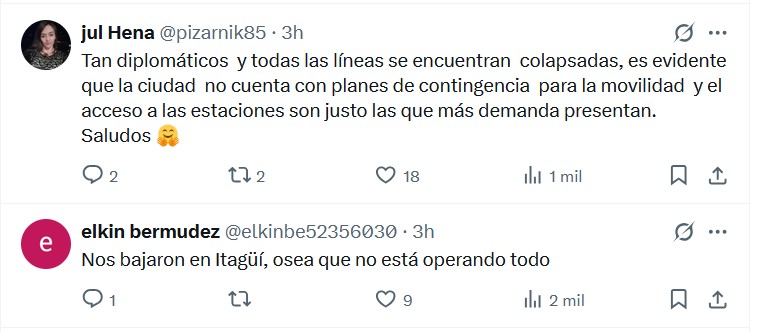 El Metro pide a los usuarios comprensión y paciencia ante la demora que pueda presentarse en sus desplazamientos habituales; sin embargo los usuarios piden «claridad en la información», pues dicen que se demoraron más de un hora para informar «la actualización», y pese a que lleva varias horas la anomalía, aseguran que «en el Metro no aclaran si alcanzan o no a reparlo este mismo jueves».