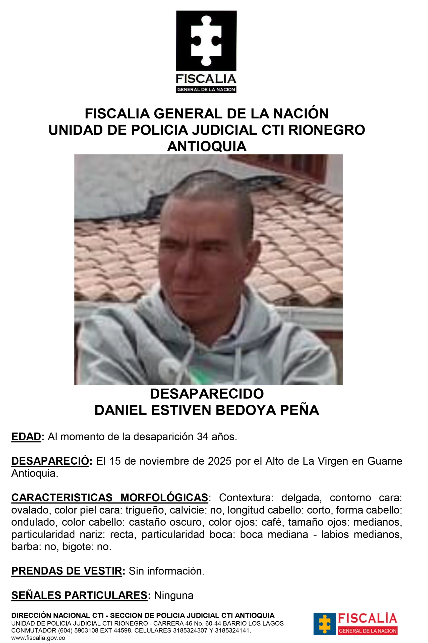 Resumen: Daniel Estiven Bedoya Peña, de 34 años al momento de su desaparición, fue visto por última vez el 15 de noviembre de 2025 en la zona del Alto de La Virgen, en el municipio de Guarne, Antioquia.