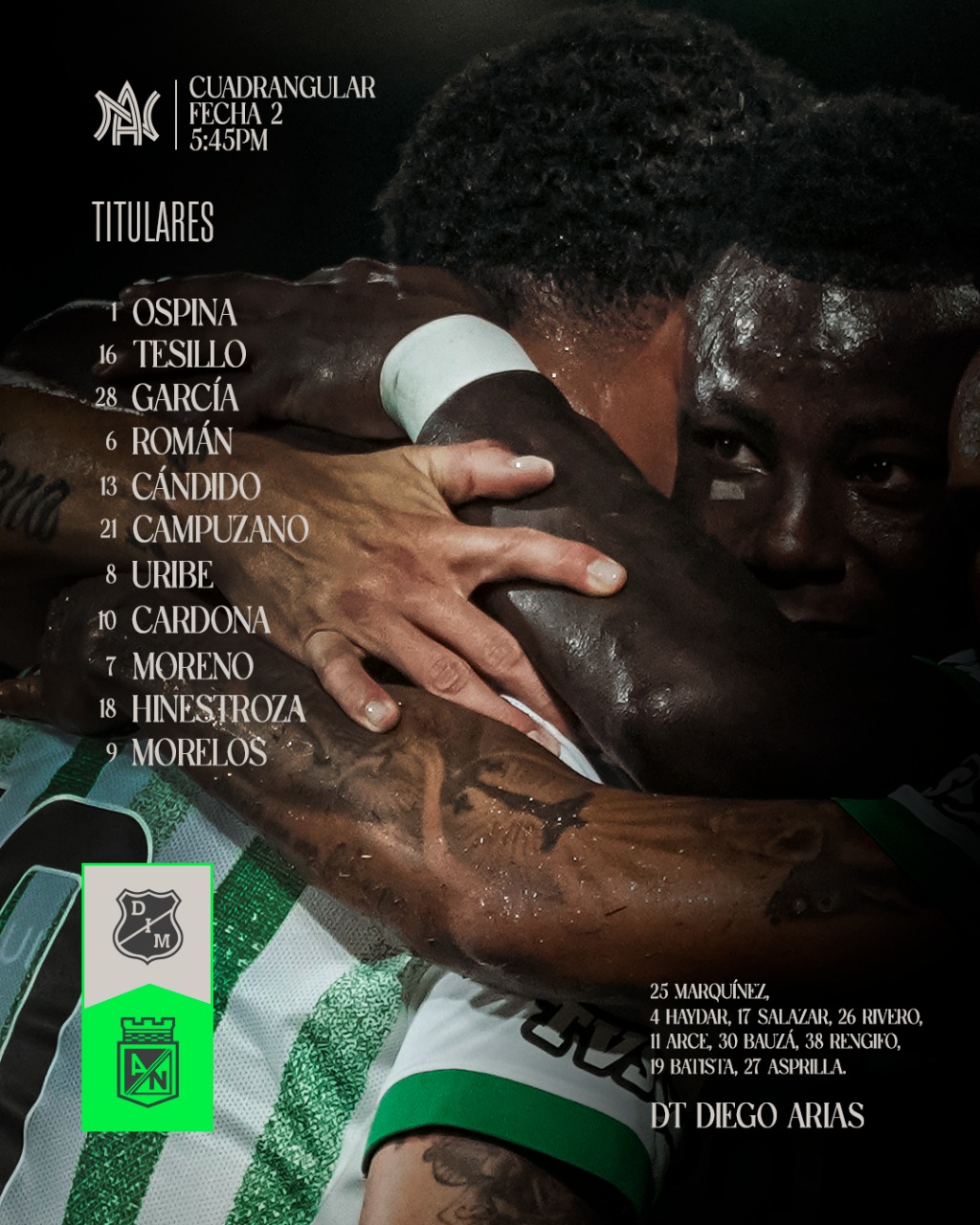 En el ataque, el verde paisa tendrá a Marino Hinestroza como extremo por derecha y a Marlos Moreno como extremo por izquierda y como 9 Alfredo Morelos.