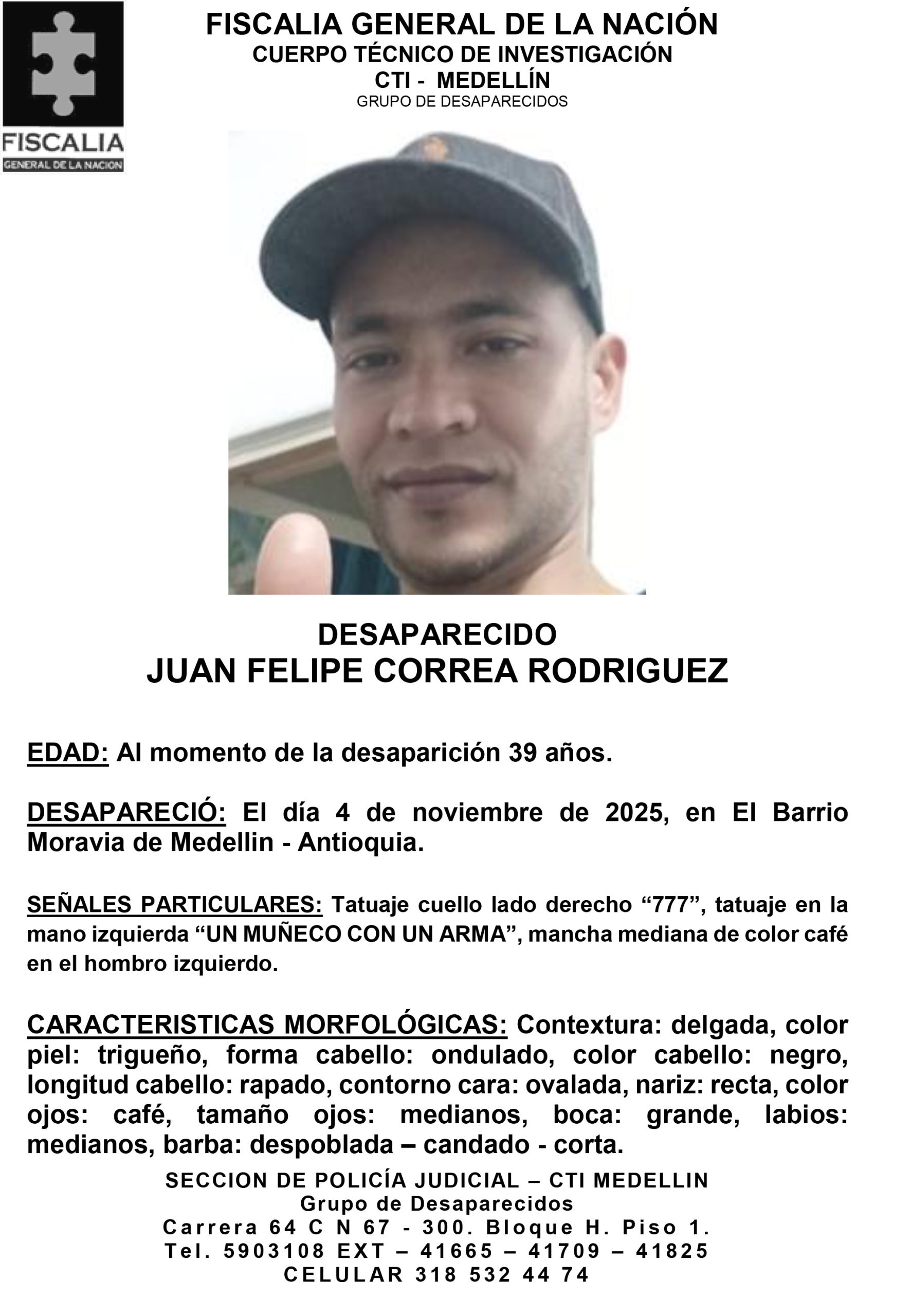 Resumen: Juan Felipe Correa Rodríguez, de 39 años, desapareció el 4 de noviembre de 2025 en el barrio Moravia de Medellín, Antioquia.