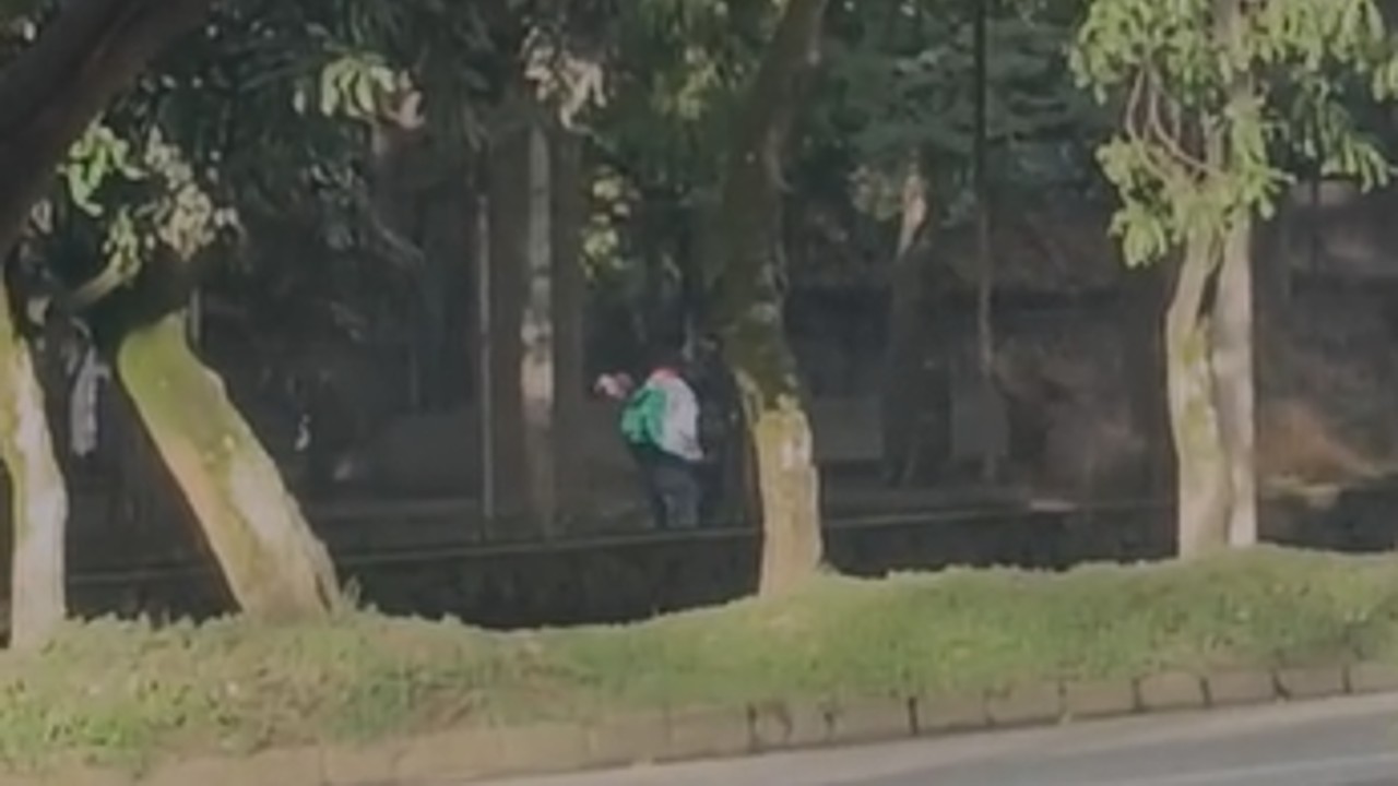 Encapuchados lanzando piedras y papas bombas desde el interior del Campus Universitario contra la Policía y portando banderas propalestina. Captura de video