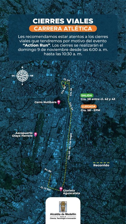 Minuto30.com .- La Alcaldía de Medellín informa sobre cierres viales totales y parciales en importantes corredores de la ciudad con motivo del evento deportivo Action Run, que se realizará este domingo 9 de noviembre.