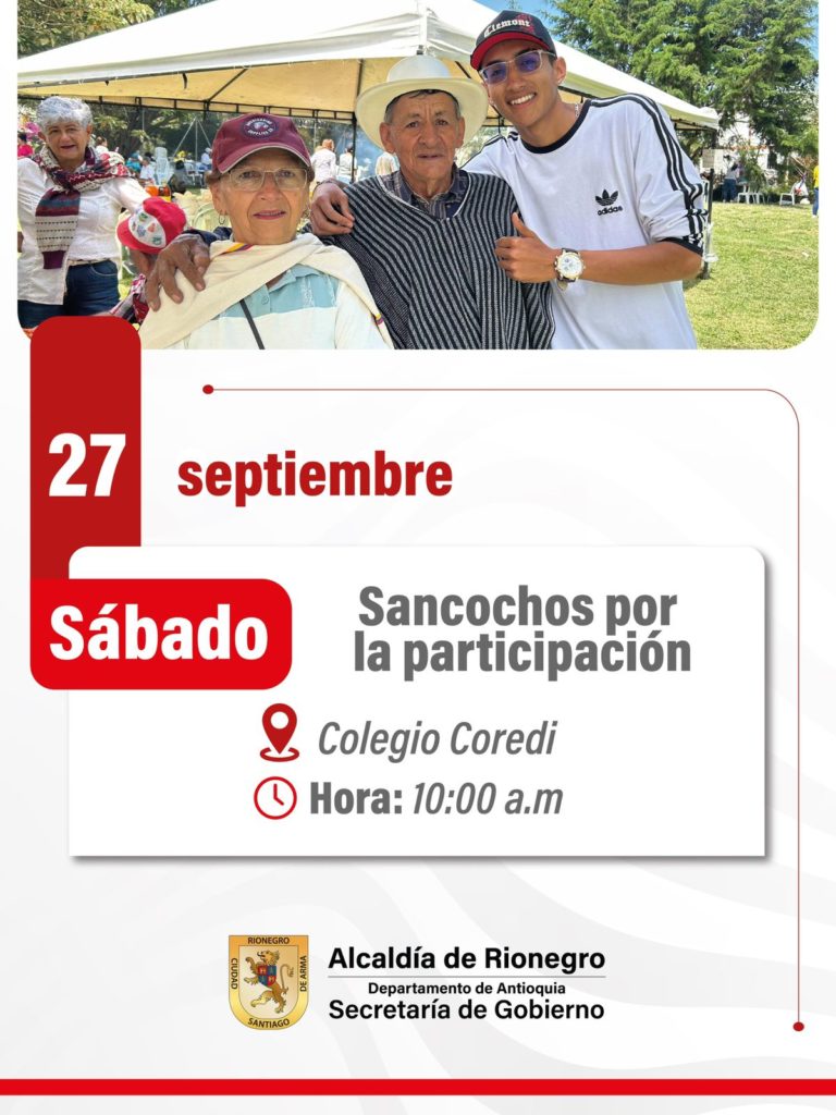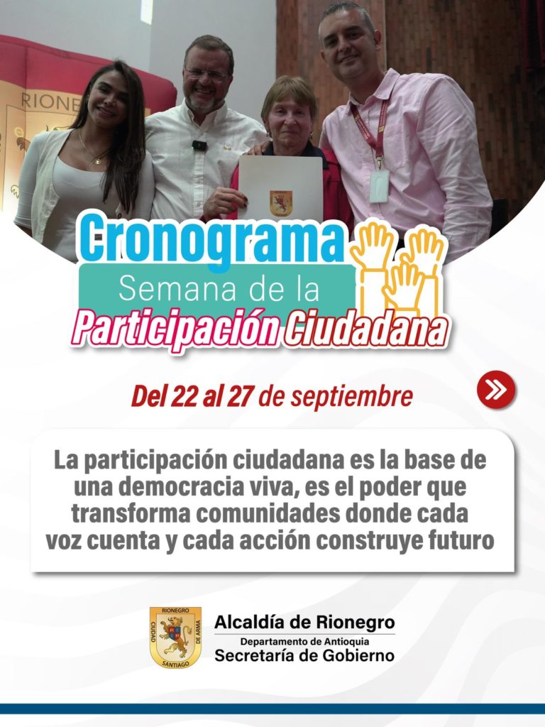 Del 22 al 27 de septiembre se desarrollará en Rionegro la Semana de la Participación Ciudadana, un espacio orientado a fortalecer el vínculo entre las instituciones y la comunidad. Durante seis días se llevarán a cabo talleres formativos, encuentros comunitarios, diálogos ciudadanos, conversatorios y actividades lúdicas enfocadas en promover la participación como un derecho y un deber colectivo.