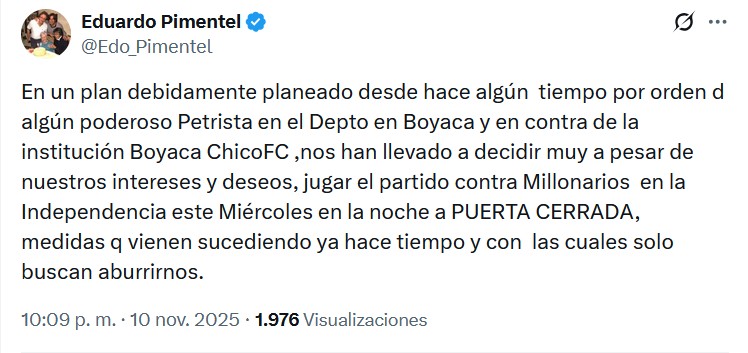 La determinación fue anunciada por el máximo accionista del Boyacá Chicó, Eduardo Pimentel, quien lanzó una dura acusación en redes sociales. Pimentel insinuó que la medida es parte de un plan orquestado por un «poderoso Petrista en el Depto en Boyacá» para perjudicar a su institución.
