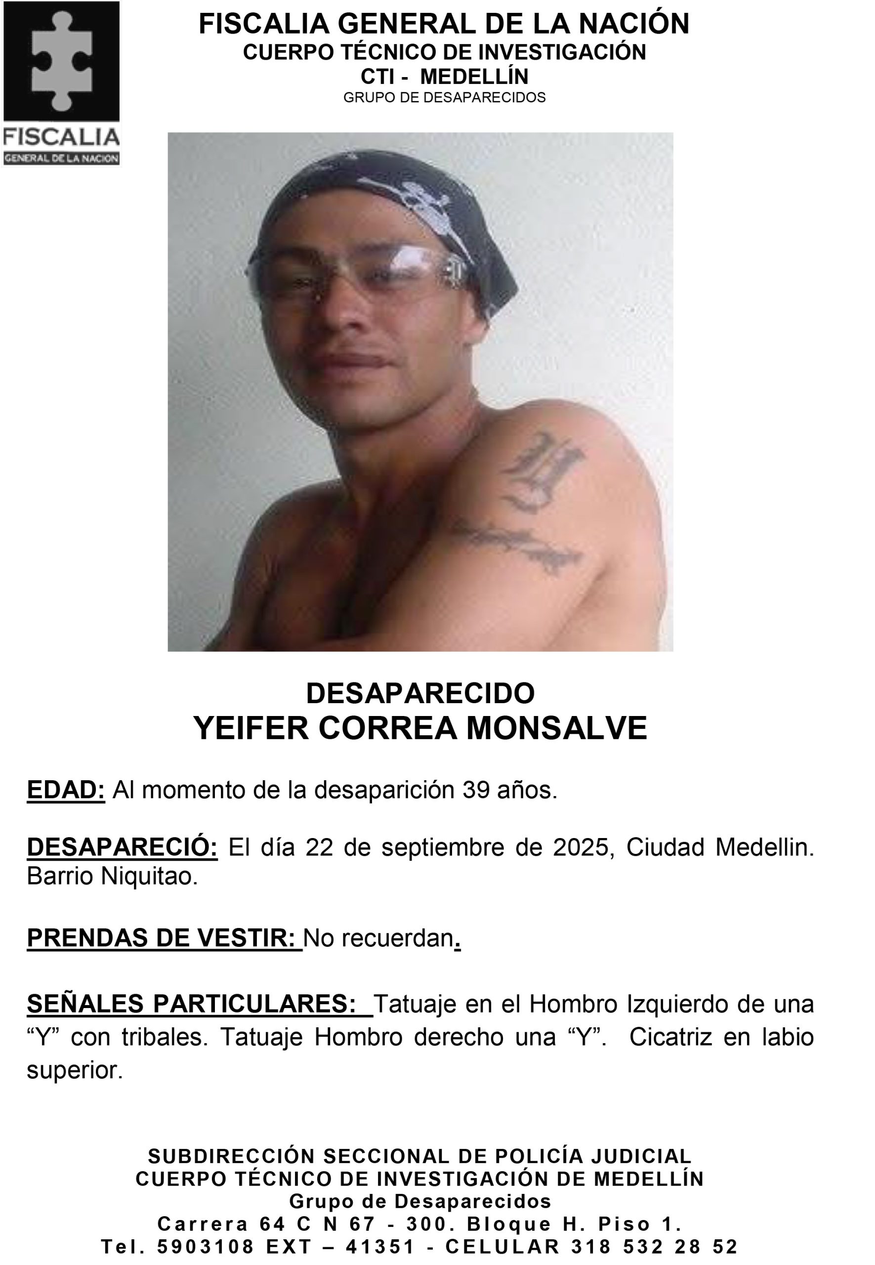 Yeifer Correa Monsalve, de 39 años, desapareció el 22 de septiembre de 2025 en la ciudad de Medellín, específicamente en el barrio Niquitao.