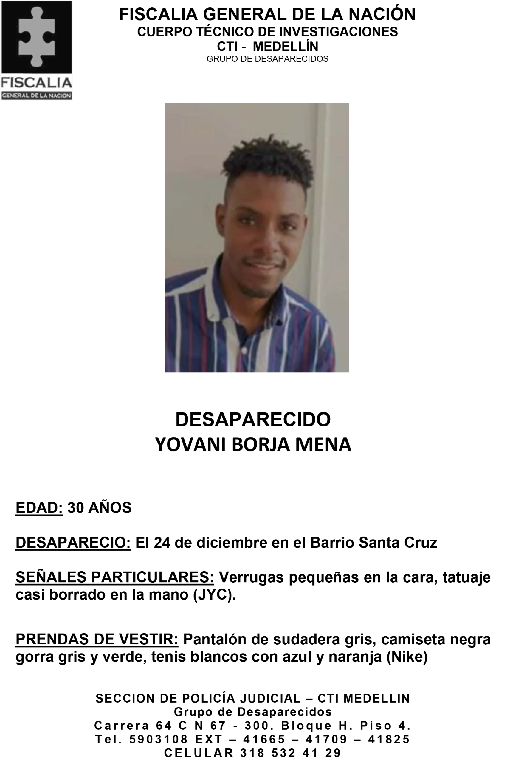 Yovani Borja Mena, de 30 años, desapareció el 24 de diciembre en el Barrio Santa Cruz. Desde esa fecha se desconoce su paradero, y las autoridades y familiares buscan información que permita dar con él.